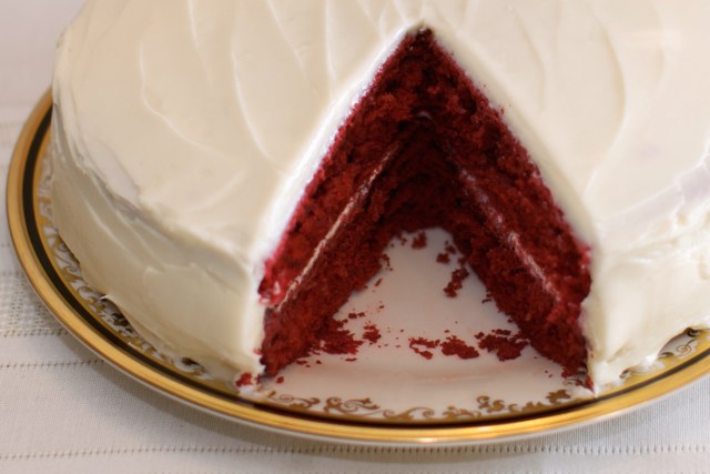 Very fun cake to make. Most recipes for red velvet cake call for 2oz. of red food coloring. That’s 2 bottles of food coloring!! 2 tablespoons is plenty for this one. Such a pretty cake and who can resist cream cheese frosting?