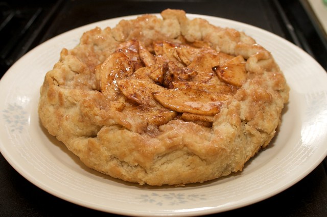 Roll dough (between two sheets of waxed paper) into a large 12 inch diameter circle or two smaller circles if you want smaller individual tarts. Remove waxed paper and place dough on parchment paper lined cookie sheet. Place the apple mixture in the middle of the dough and fold the dough inwards, pinching edges. Dot the apples with bits of butter.
