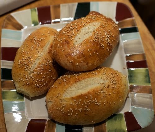 Add ingredients (except sesame seeds) to mixing bowl and knead for 5 minutes. Place dough ball into greased bowl and cover with plastic. Let rise for 1 hour. Turn dough out on floured surface and cut into bun size that you would like and shape. Place on a baking pan (I use corn meal on the bottom) cover with a towel and rise one more time for 1 hour. Brush with egg wash and sprinkle with sesame seeds (optional) Bake in preheated oven @ 400 for about 20 minutes.