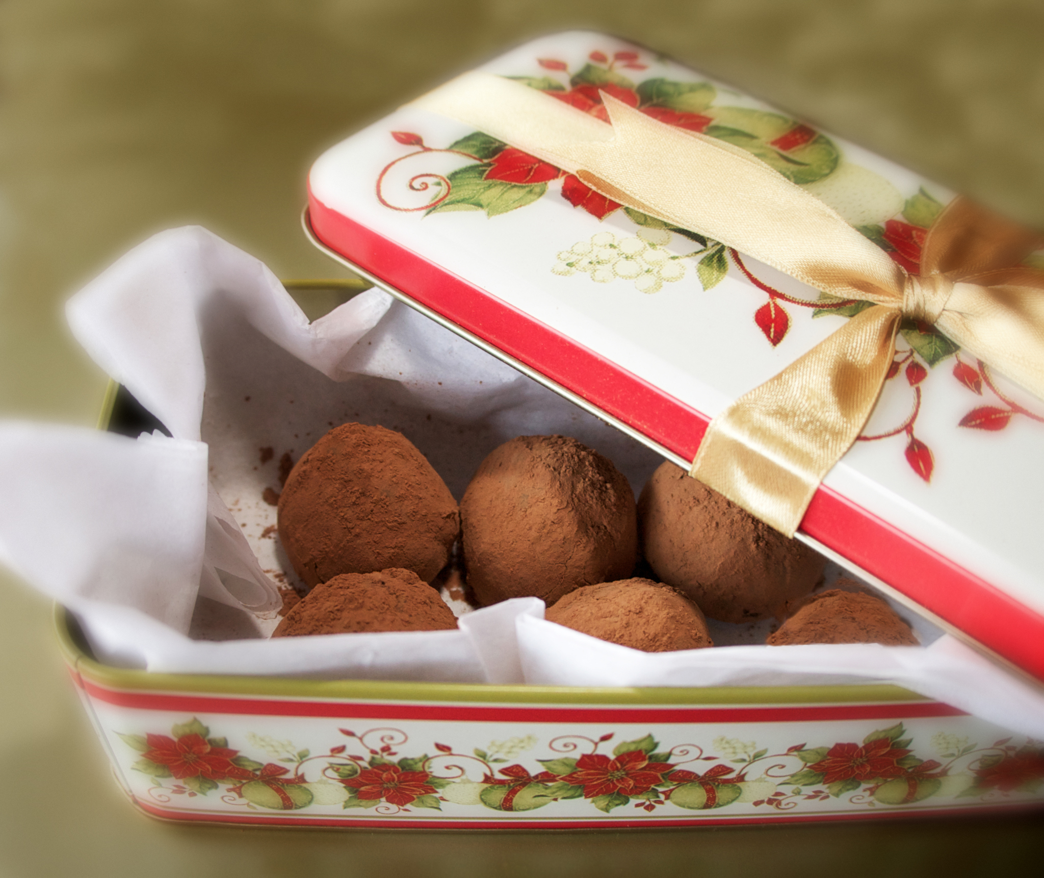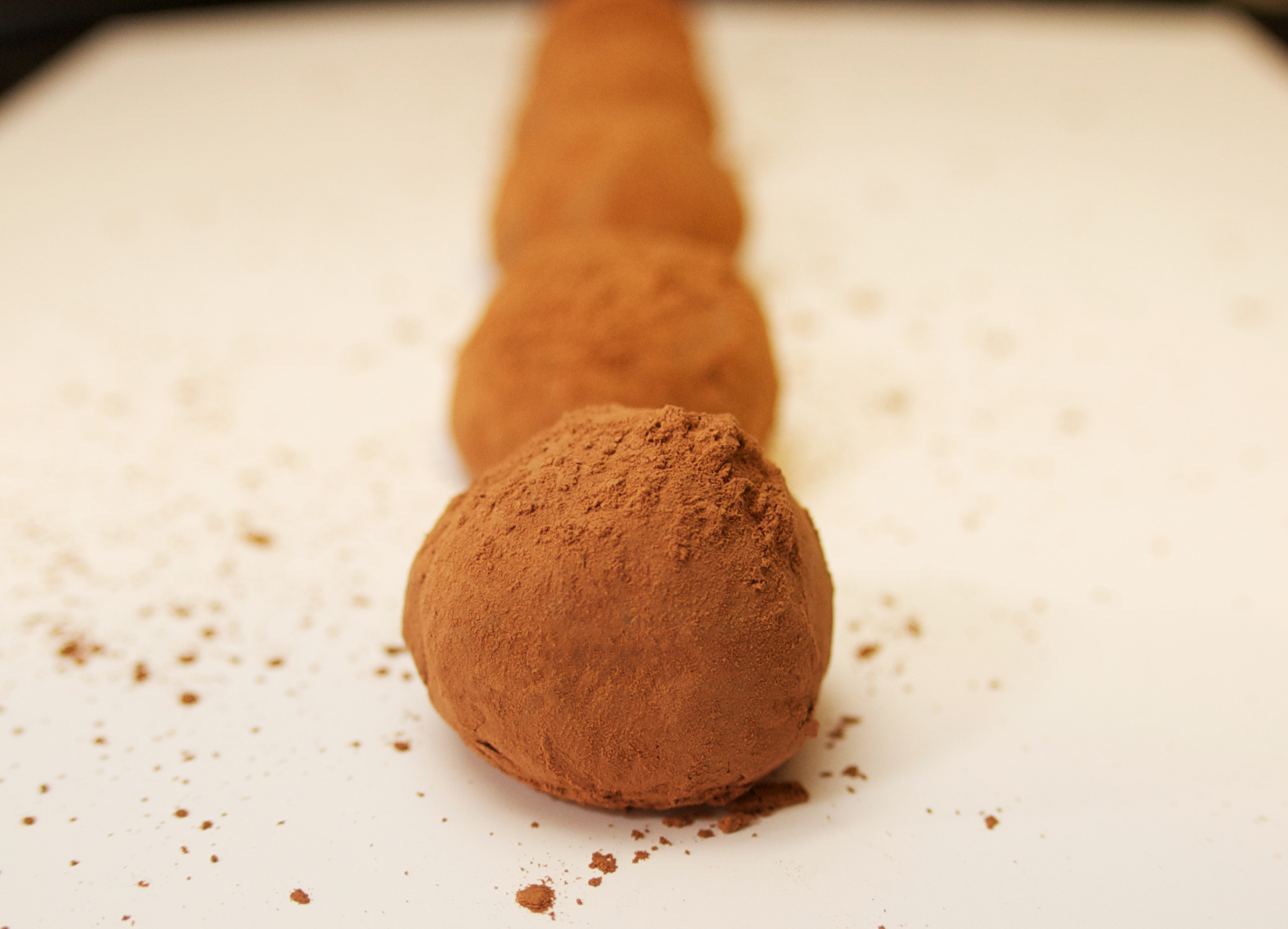 Now that the ganache balls are roughly formed, it’s time to make them round. Dust your hands with cocoa powder and pick up a cocoa-covered ganache ball. Gently roll it between your palms until it is round and coat it with cocoa powder, then place it on a foil-lined baking sheet. Because the ball is already covered with cocoa powder and is fairly firm, it should be easy to shape and not stick to your palms very much. Repeat with remaining ganache and cocoa powder. If at any time the ganache becomes too soft to work with, place it in the refrigerator to chill for a few minutes.