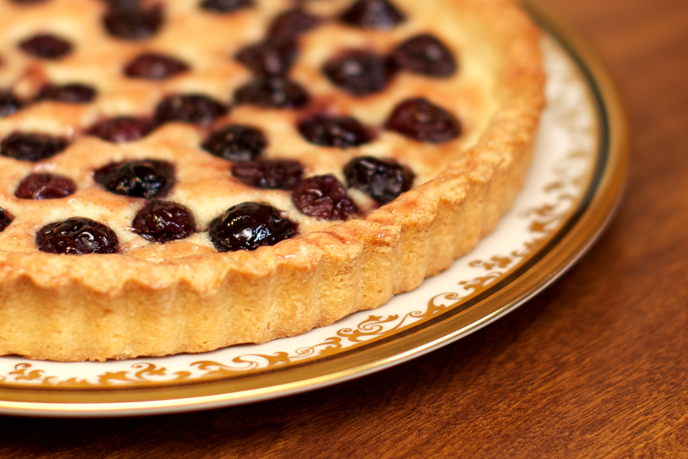 This is made with a fluted pastry shell and fills it with a layer of almond flavored cream (Frangipane) and pitted sweet Bing Cherries. To make the cherries glisten, after the tart comes out of the oven each cherry is lightly brushed with red currant jelly. Enjoy!