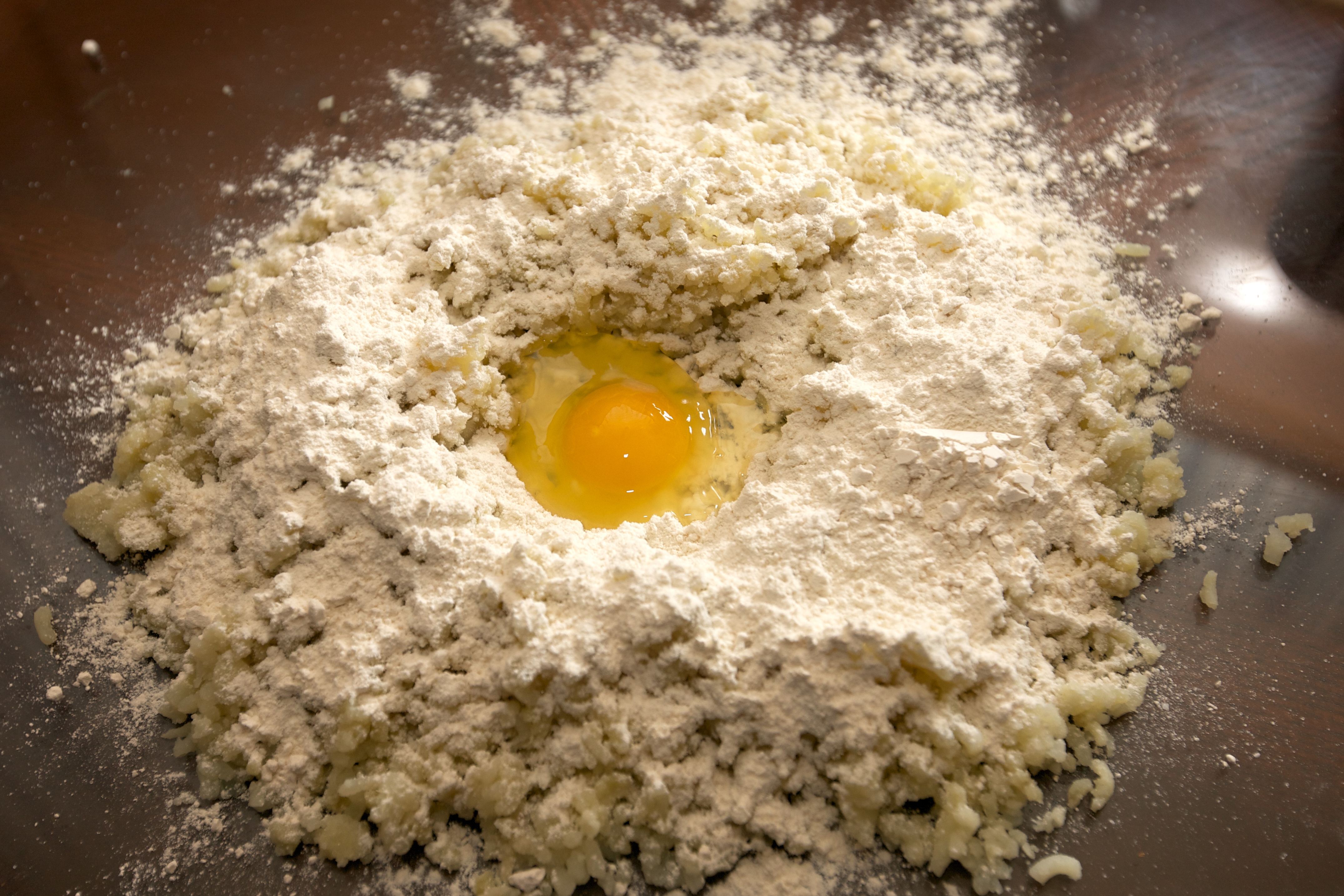 Once the potatoes have cooled, gather the potatoes and make a well. Sprinkle the flour and salt on them and crack the egg in the middle. With a fork scramble the egg and incorporate the potatoes. You may have to add more flour. Don’t work it too much or the gnocchi will be too tough. You will eventually get a ball of dough.