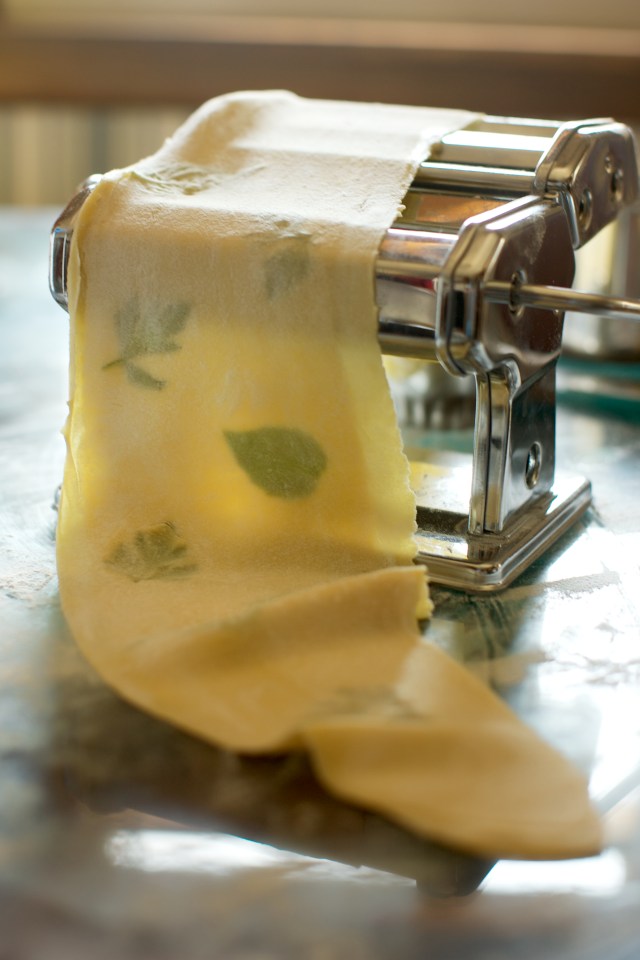 All you need is some fresh basil and Italian parsley. When you have one sheet of pasta rolled out, place small leaves every few inches. Wet the edges of the pasta and place another sheet on top. Roll that whole piece through your pasta roller one more time to seal.