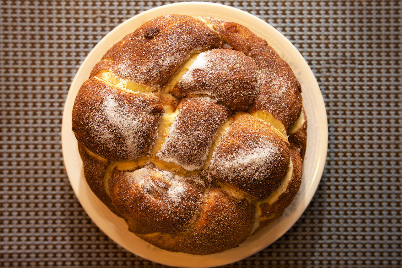 There are several ways you can shape this bread. One long rope is easy. Then coil the rope inside of a lightly greased 10 inch cake pan. Or you can shape several round balls and place them inside of your pan next to each other. I braided mine and used a springform pan lined with parchment. Cover and let rise another 60-90 minutes until puffy.