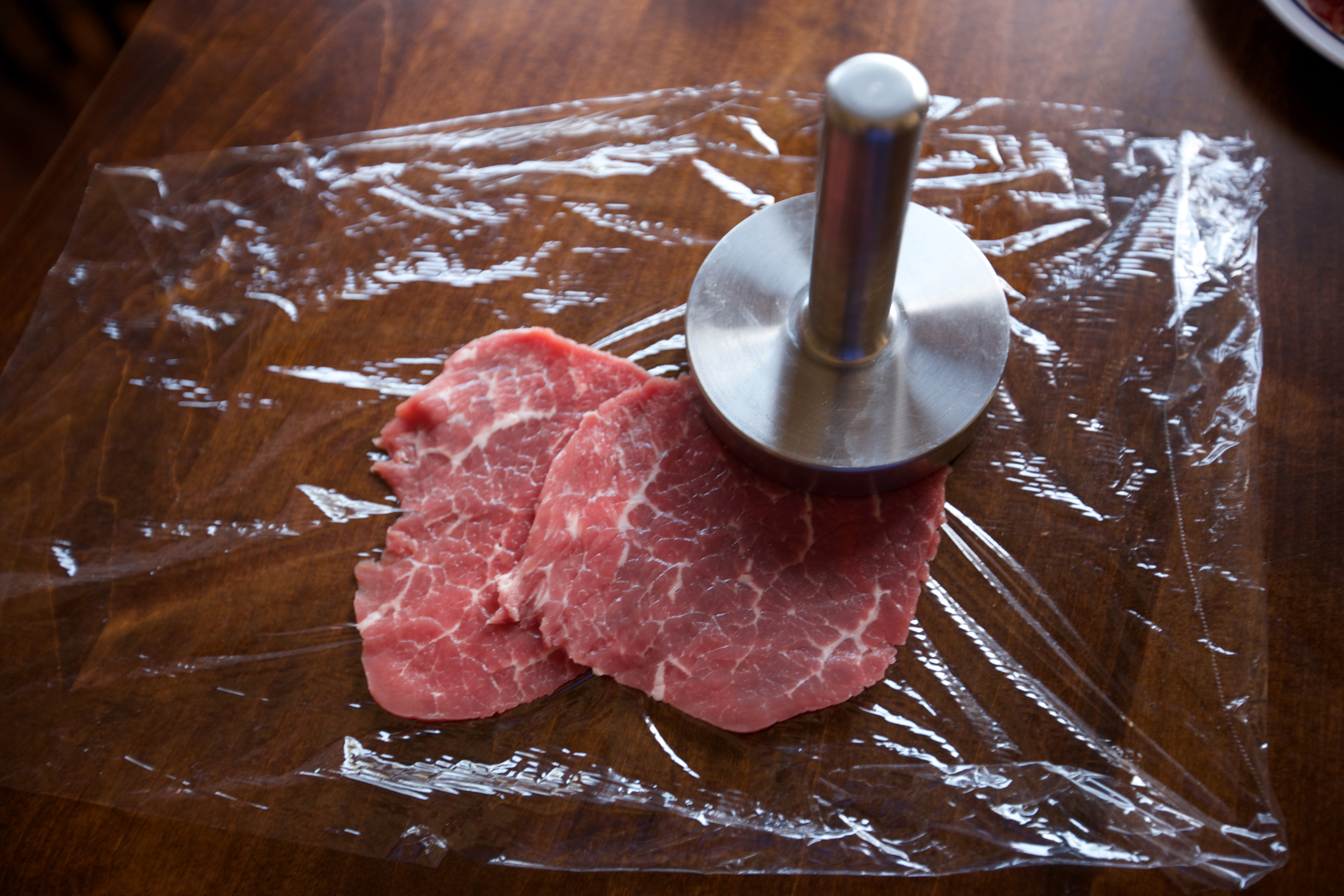 2 lbs very thin sliced (about ¼ inch) tenderloin or rump roast. Pound out each slice thinner. You will need a slice about 3×4 inches. Freezing the meat slightly before
