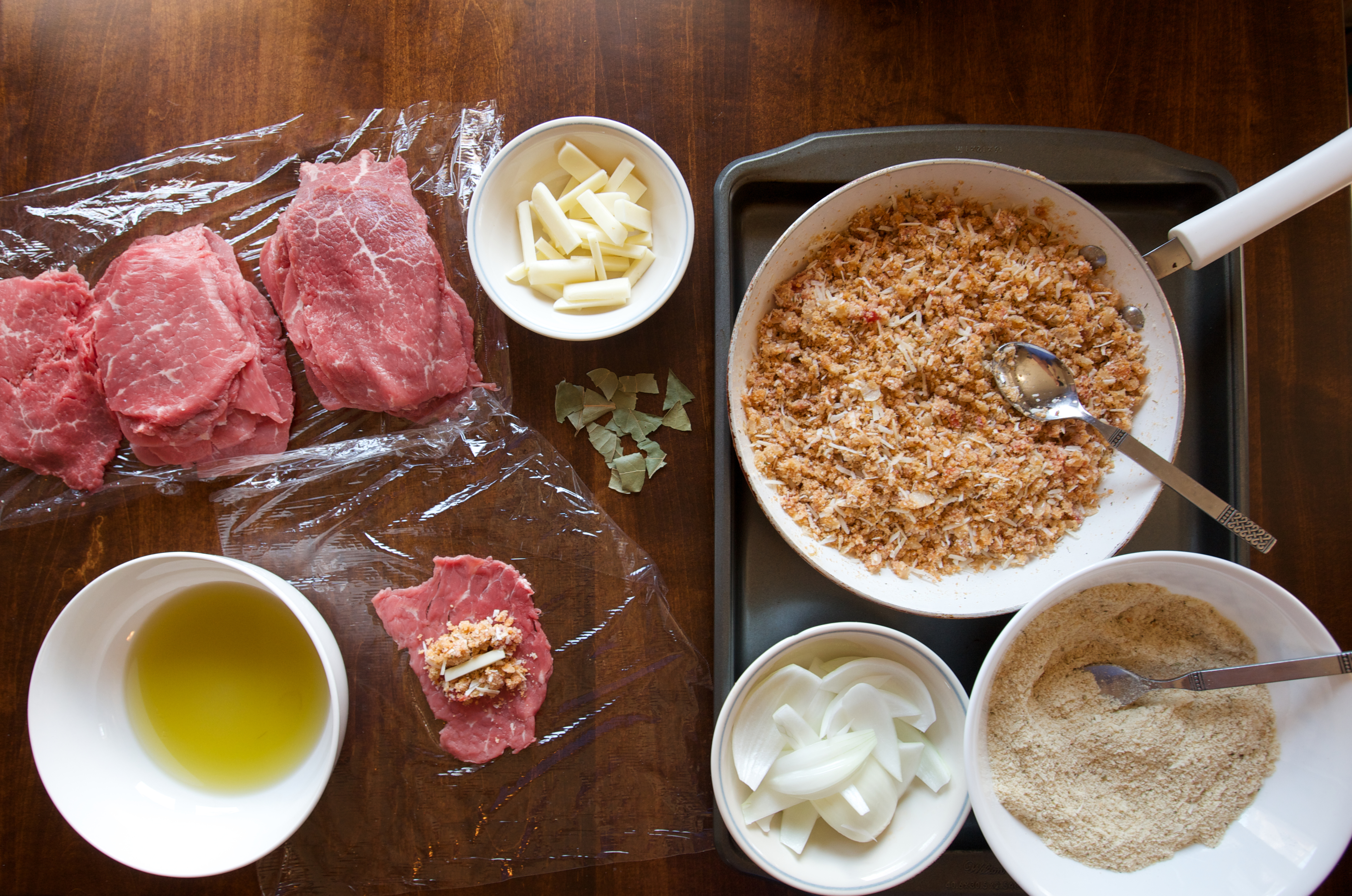 Lay out thin pounded sliced meat, top with filling mixture, top with a small piece of mozzarella cheese or provolone. Roll up meat. Do this with all your slices of meat.